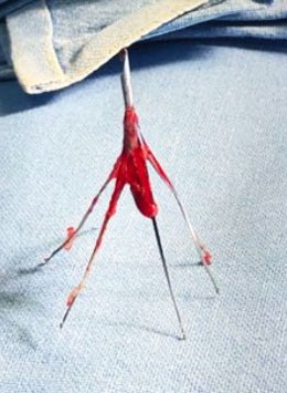 Complications from the procedure may include bleeding at the insertion site; or very rarely stroke or pulmonary embolism.