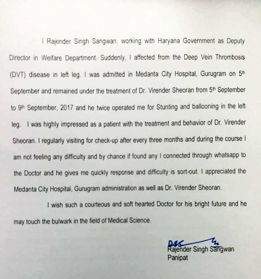I Rajender Singh Sangwan, working with Haryanak Government as Deputy Director in Welfare Department. Suddenly, I affacted from the Deep Vein Thrombsis(DVT) disease in the left leg. I was admitted in Medanta City Hospital, Gurgaon on 5th September and remained under the treatment of Dr. Virender Sheorain from 5th September to 9th September 2017 and he twice operated me for Stunting and ballooning in the left leg. I was highly impressed as a patient with the treatment and behaviour of Dr. Virender Sheorain. I regularly visiting for check-up after every three monthsand during the course i am not feeling any difficulty and by chance if found any I connected through wahtsapp to the doctor and he gives me quickly response and difficulty is sort-out. I appreciated the Madanta City Hospital, Gurgaon administration as well as Dr Virender Sheorain.